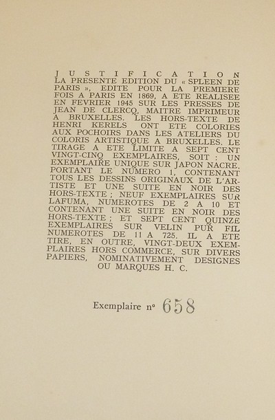Description : Illustrations en couleurs de Henri Kerels. Aux éditions Terres Latines, 1945. Petit in 8 broché sur vélin pur fil justifié 658/725, avec couverture illustrée, en bon état. Il est imprimé à la fin de l'ouvrage : « Un accident s'est produit dans le transport des hors-texte, rendant impossible leur utilisation. Le présent ouvrage parait donc simplement avec un frontispice ».
