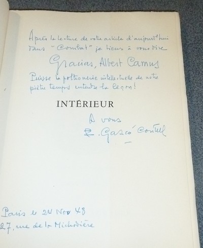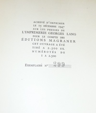 Description : Longue dédicace autographe signée par l'auteur à l'adresse d'Albert Camus et datée de novembre 1948. Avec 11 dessins à la plume de Marie Banégas, Magraner, Paris, 1947. Au format in 8 broché comprenant avec couverture bleue repliée et défraichie, 111 pages + table sur papier justifié. En assez bon état.