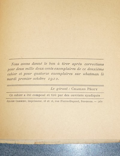 Description : Cahiers de la Quinzaine, 6 Octobre 1912, Deuxième cahier de la Quatorzième série. Premier tirage limité à 2200 exemplaire du Dixième volume, 1re partie, de la Saga « Jean-Christophe » et troisième partie (partie 1) de Jean-Christophe, la fin du voyage. Au format in 12 broché comprenant en pagination continue, papier acide, couverture légèrement défraichie, mais en assez bon état. A noter que « La fin du voyage » la partie III « La nouvelle journée » est en deux volumes, 2e et 3e cahiers de la 14e série, 1912. A noter aussi : Jean-Christophe (1904-12), cycle de dix volumes répartis en trois séries, Jean-Christophe, Jean-Christophe à Paris et La Fin du voyage, publiés dans les Cahiers de la Quinzaine.