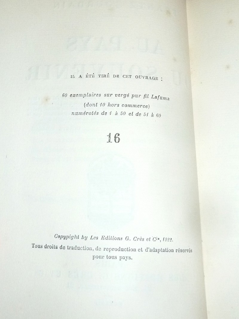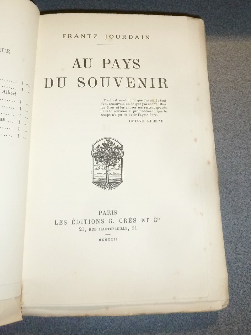 Description : « Mémoires d'écrivains et d'artistes », éditions Grès et Cie, 1922, édition originale 16/60 sur vergé pur fil Lafuma seul papier, au format in 8 broché de 275 pages + table, grand de marge, non rogné, en bel état.