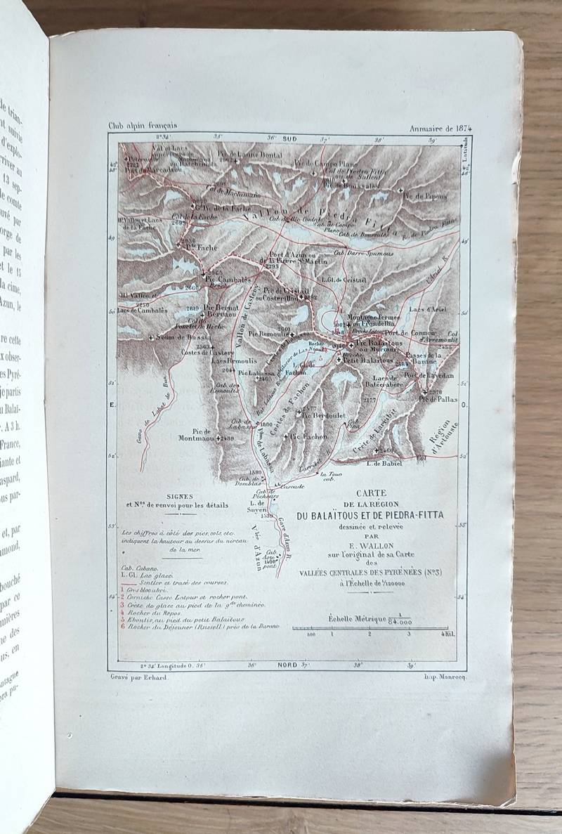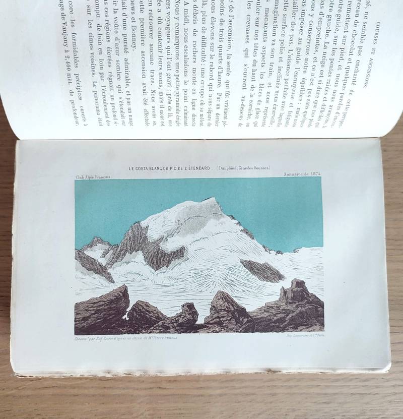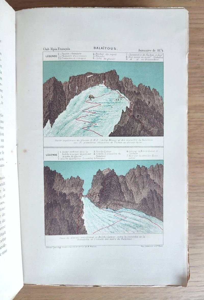 Description : Au siège social du club alpin français (et à la librairie Hachette), 1875. Fort in 8 broché contenant gravures et plans dans le texte, 10 hors texte dont cartes dépliantes, 1 lithographie « Le Pont-en-Royans », planches en couleurs, mais sans les deux cartes jointes dans un rouleau parues ultérieurement, indication donné par un avis sur papier rose, quelques épidermures sur les premières pages. XXIV + 552 pages + 32 pages, la liste des membres : Section de Paris - d'Auvergne - des Hautes-Alpes - de l'Isère - de la Savoie (avec la sous section d'Aix les Bains) - de Lyon - des Vosges - de Saône et Loire, contient aussi en plus des articles de Montagne, un article sur les club alpins étrangers et une bibliographie et cartographie française, avec 4 pages des statuts du club alpin. Exemplaire en assez bon état, d'une grande rareté bien complet de ses statuts et liste des membres fondateurs.
