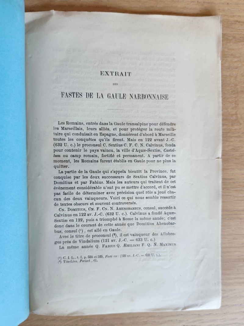 Description : Plaquette in 8 brochée de 6 pages, extrait des « Annales de la faculté des lettres de Bordeaux », 1882. A noter : conjecture sur les rôles jouées par les successeurs de Sextius Calvinus, par Domitius et Fabius dans la conquête de la Gaule après les victoires contres les Allobroges et les Arvernes.