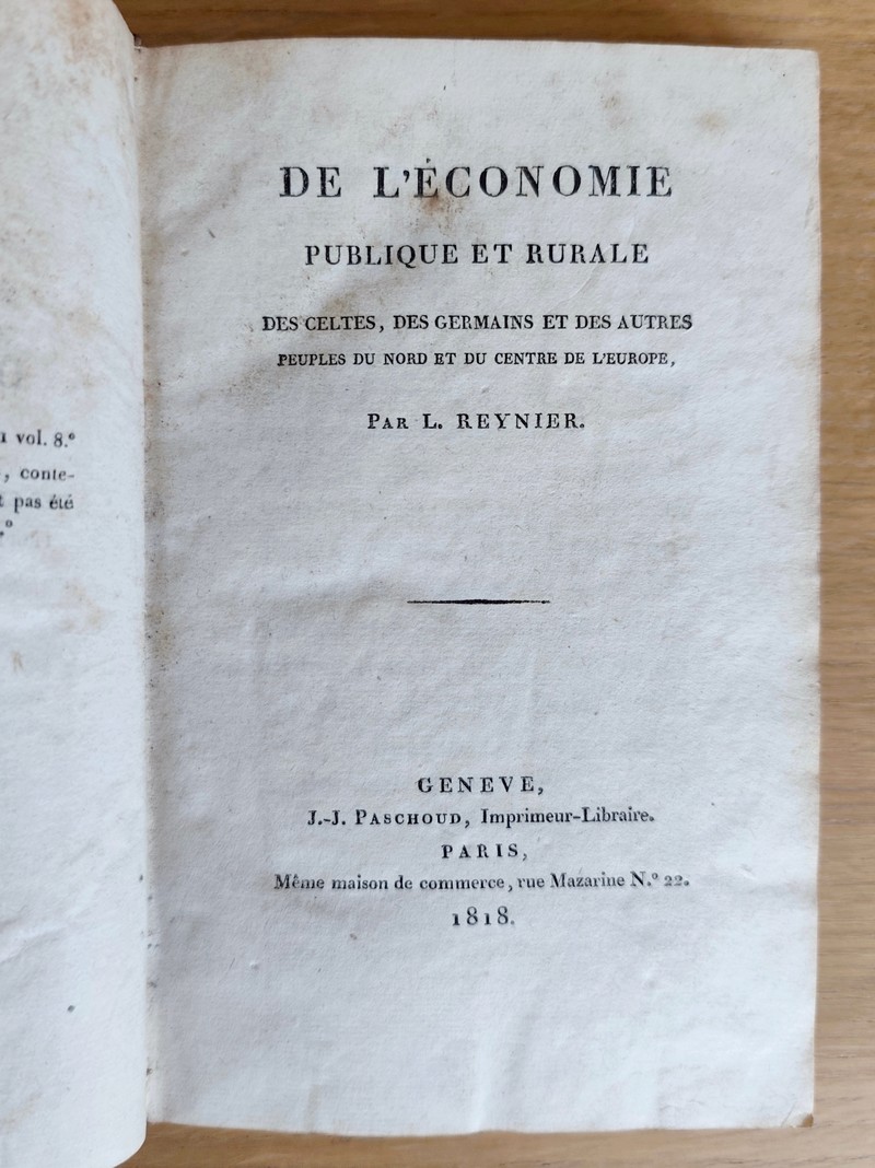 Description : Chez Paschoud J.-J., imprimeur libraire, 1818, Genève. Au format in 8 comprenant XXIV (préface), 551 pages, ajout d'une table des matières manuscrite. Relié en demi basane d'époque, dos lisse, caissons ornementés, en bon état. A noter : l'auteur, Jean-Louis-Antoine Reynier, est un naturaliste suisse, 1762 - 1824. Il s'adonna surtout à la botanique et à l'économie rurale. Dans cet ouvrage sur les Celtes qu'il mit 25 ans à écrire, il y développe les chapitres : I/ Considération générale sur les époques les plus reculés. II/ De l'organisation politique et des administrations civiles et militaires. III/ De la religion dans ses rapports avec l'économie publique. IV/ des finances. V/ De l'industrie et du commerce. VI/ De l'agriculture. VII/ Additions et correction. Table alphabétique des matières.