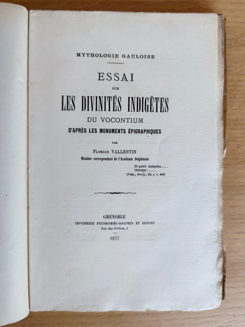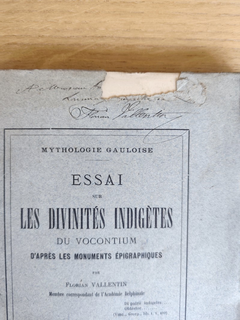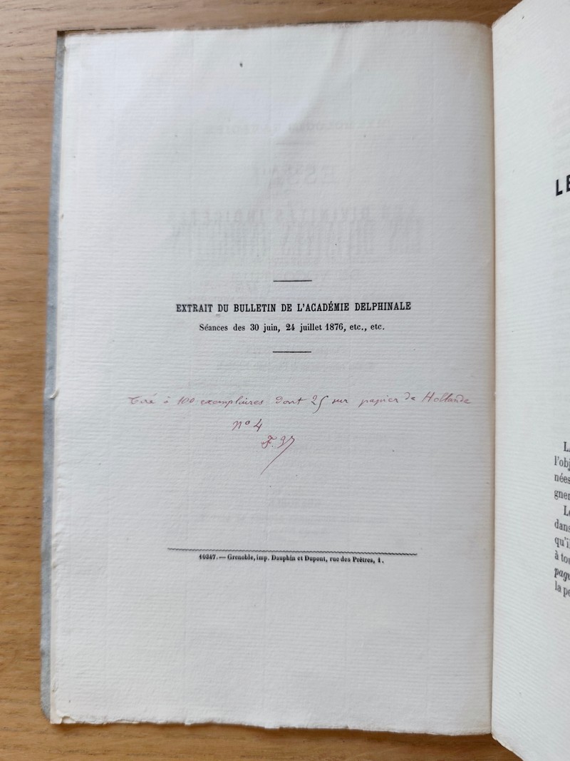 Description : Exemplaire n° 4 sur 25 sur papier de Hollande, au tirage de 100 pour ce tiré à part de l'imprimerie Prudhomme-Dauphin et Dupont, 1877, Grenoble. Dédicace sur la page de couverture avec petit manque, signature complète. Au format in 8 broché de 87 pages, en assez bon état malgré ce petit manque. A noter : la pagination devait s'arrêter à 76 mais un addenda et errata a été ajouté en feuille libre avec pagination continue.