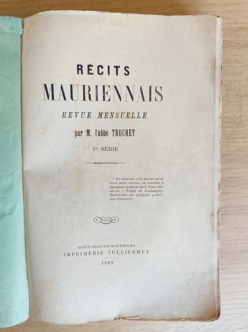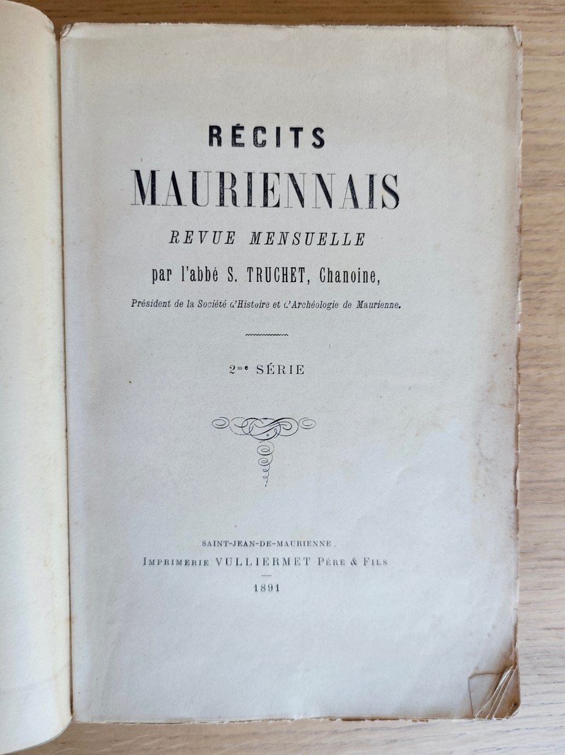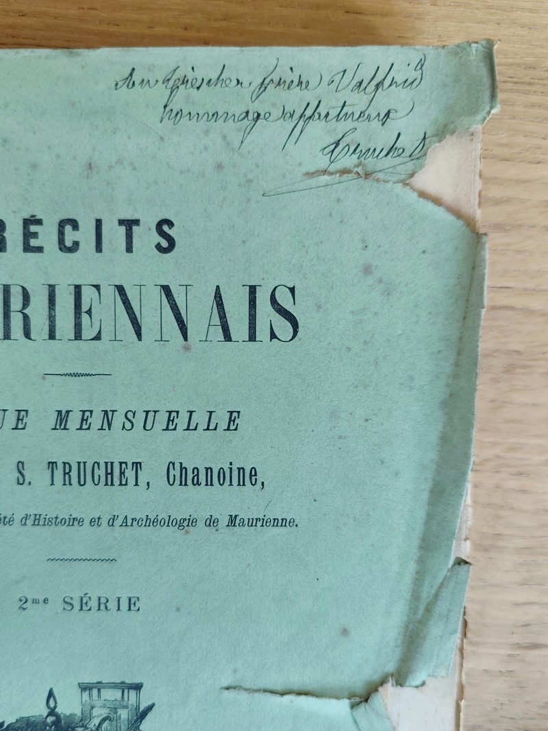 Description : Édité par l'imprimerie Vulliermet Père et fils de 1889 à 1892 à Saint Jean de Maurienne. Dédicace de l'abbé Truchet en couverture de la seconde série. 2 volumes au format in 8 avec couverture fatiguées et abimées. La Première série est complète sous brochage vert, du n° 1 d'octobre 1889 au n° 12 de septembre 1890, V (envoi à Monsieur Dufour), 378 pages dont 3 pages de table. La seconde série est complète, IV (aux souscripteurs), 380 pages dont 3 de table des matières, du n° 1 d'octobre 1891 à n° 12 de septembre 1892. A noter : ouvrage le plus rare de l'abbé Sébastien Truchet et très recherché. Il est riche d'anecdotes, de récits authentiques uniquement sur la Maurienne. L'abbé Saturnin Truchet (1828-1920) est un Historien. Prêtre du diocèse de Maurienne, chanoine titulaire (à partir de 1885), Curé de St-Quentin-sur-Isère, vicaire de Jarrier. Membre de l'Académie de Savoie et membre fondateur de la Société d'histoire et d'archéologie de Maurienne, dont il fut le président de 1899 à 1904.