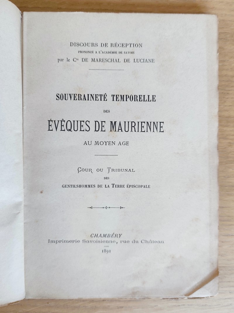 Description : Discours de réception prononcé à l'Académie de Savoie par Le Cte de Mareschal de Luciane dans la séance du 12 février 1891. Imprimerie Savoisienne, 1891, Chambéry. Extrait et tiré à part des Mémoires du SSHA, au format in 8 broché avec couverture fatiguée et dos cassé, de 128 pages + table + errata.