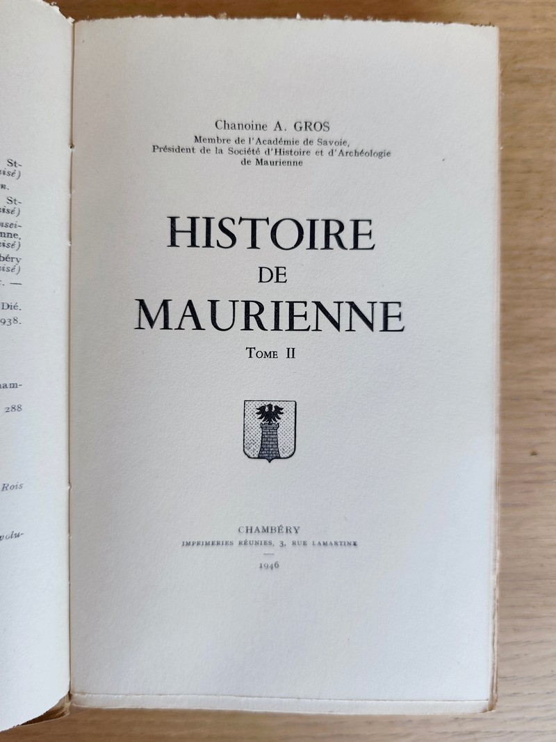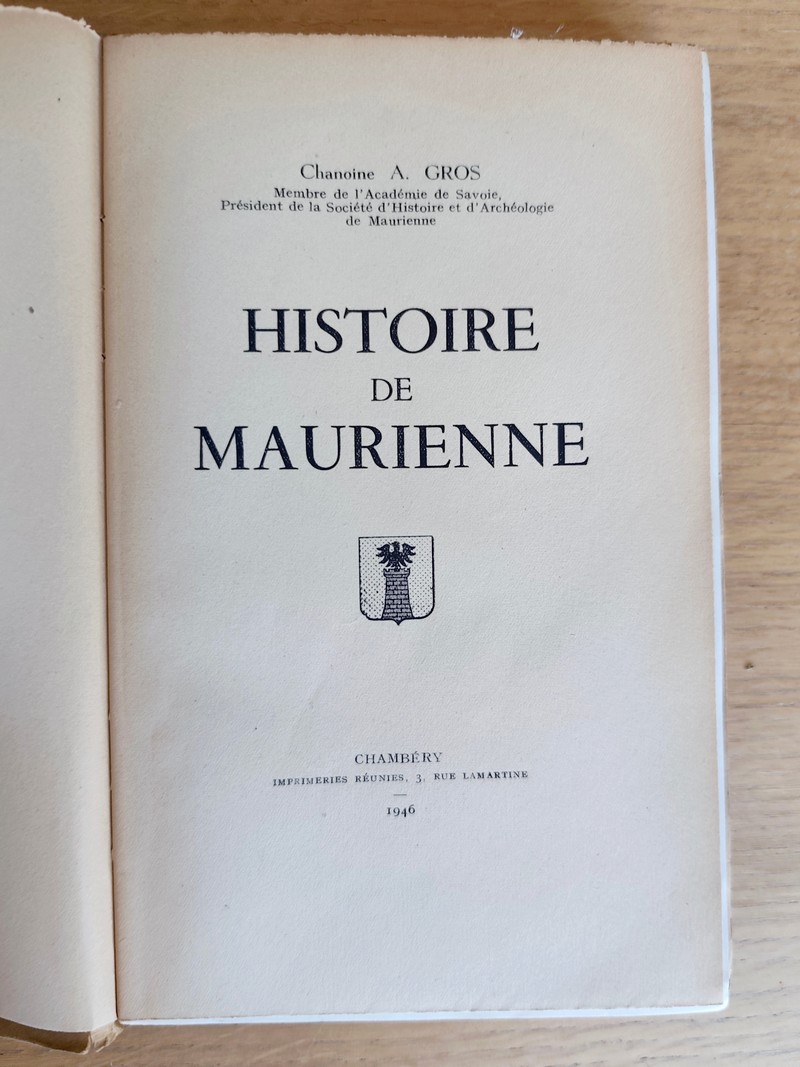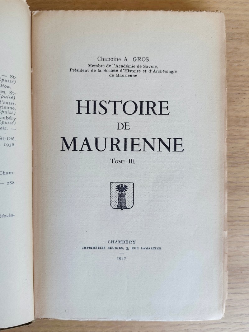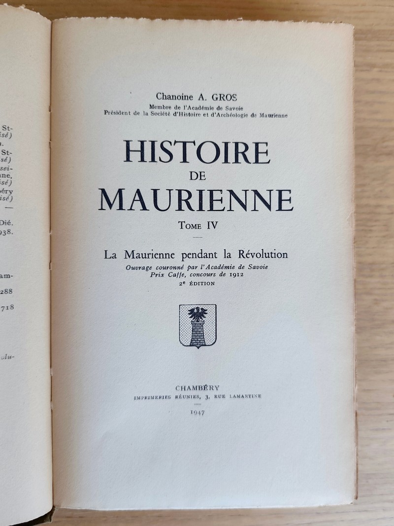 Description : Imprimerie Réunies, 1946-1947, Chambéry. 4 volumes in 8 brochés en très bon état. Il s'agit des 4 volumes posthumes écrit par le Chanoine A. Gros, mort en 1945 (1864-1945), ils serons complétés par 2 volumes par le chanoine Louis Gros, son neveu sur l'Empire et la Restauration jusqu'à l'Annexion, édités en 1955. Le tome 1 possède une dédicace autographe manuscrite de Louis Gros en 1948, qui a été à l'initiative de cette édition. Tome I : portrait frontispice, 263 pages. Tome II : 285 pages. Tome III : 279 pages. Tome IV : avec pour sous titre « La Maurienne pendant la Révolution », 651 pages non coupées, le tout en broché en très bon état. A noter : le chanoine Adolphe Gros (1864-1945) est un prêtre et un historien local sur la Maurienne. Président de la Société d'histoire et d'archéologie de Maurienne de 1917 à 1945.