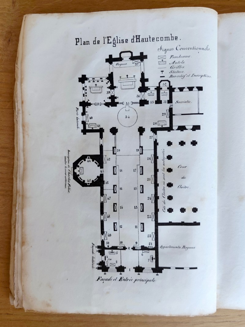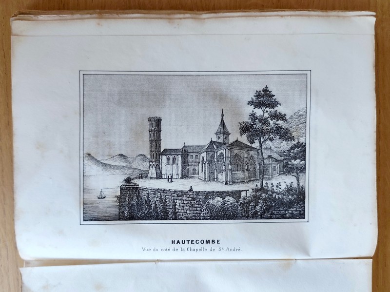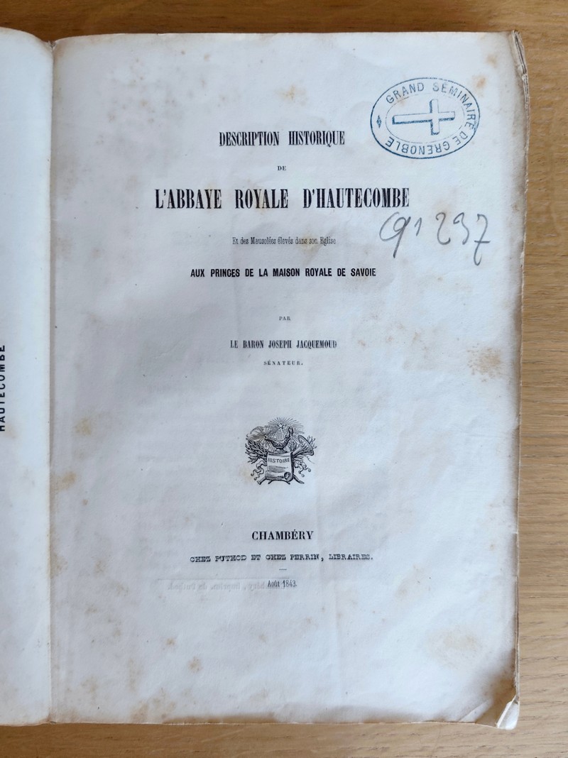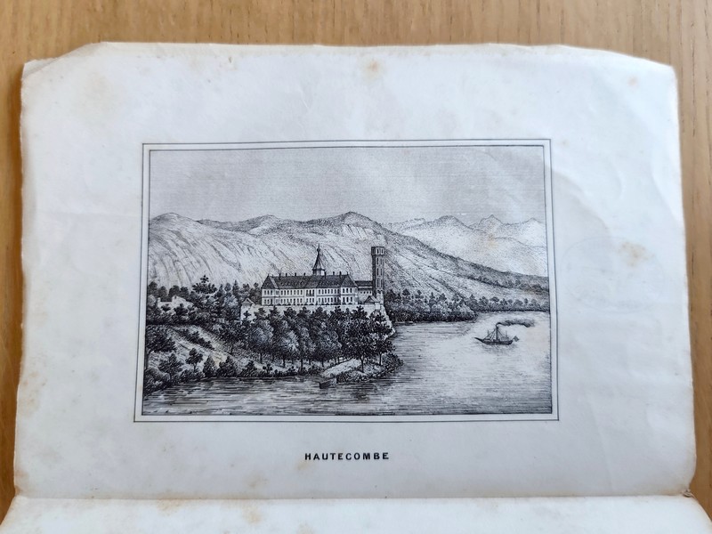 Description : Avec 3 gravures en hors texte et un plan. Chez Puthod et Perrin, août 1843, Chambéry. Au format in 8 comprenant 145 pages avec gravures « Hautecombe vue du lac » frontispice, « Façade principale », « Plan de l'église » avec en frontispice la signification des numéros tracés sur le plan, « Vue du côté de la chapelle de St-André ». Exemplaire défraichie, ancien cachet de bibliothèque.