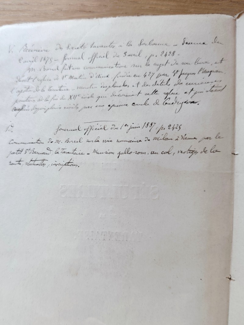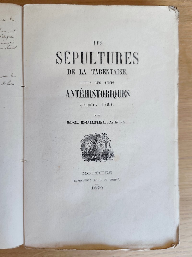 Description : Imprimerie Crud et Cie, 1870, Moutiers. In 8 broché avec couverture défraichie et abimée comprenant XXIII, de 9 à 207, avec un supplément en feuilles libres « Tombeau romains sur le parcours de la nationale n° 90 entre Villette et Aime », page 205 à 228. Commentaires manuscrits en frontispice de la page de titre sur des communications de Borrel. A noter : il s'agit des découvertes de tombes antiques et romaines en Tarentaise puis celles jusqu'au XVIIIe. Le supplément est une découverte d'une tombe romaine et le descriptif de son contenu. Ouvrage rare et recherché.