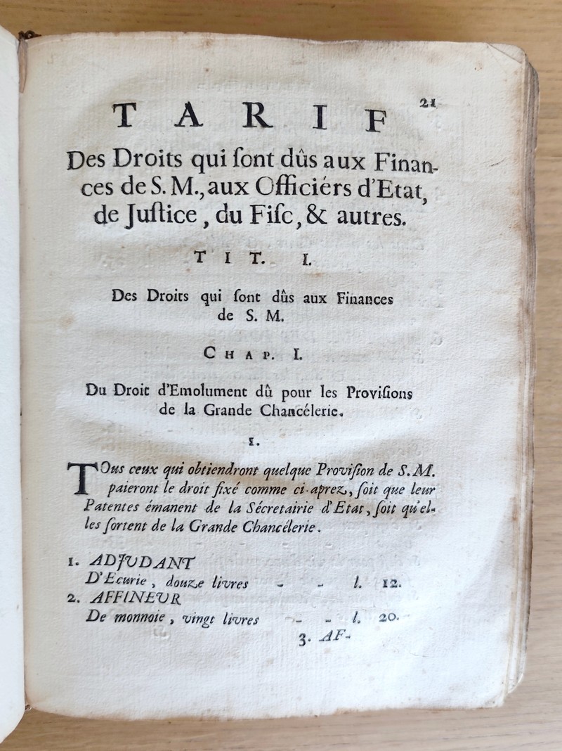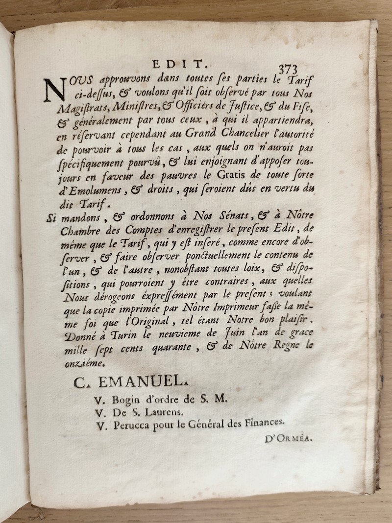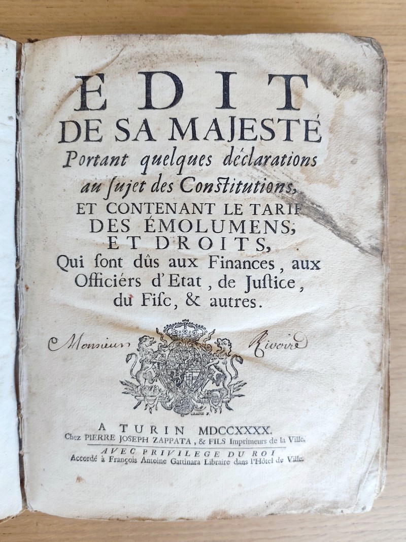 Description : Chez Pierre Joseph Zappata et fils, 1740, à Turin. Au format in 4 comprenant 373 pages + 17 ff (table du tarif), ayant quelques poussières et taches. Ex-libris manuscrit. Le tout en plein vélin d'époque avec épidermures et petit manque de vélin, sinon en assez bon état. A noter : en page 373 l'édit reprend le placard d'application, imprimé avec C. Emanuel le 9 juin 1740.