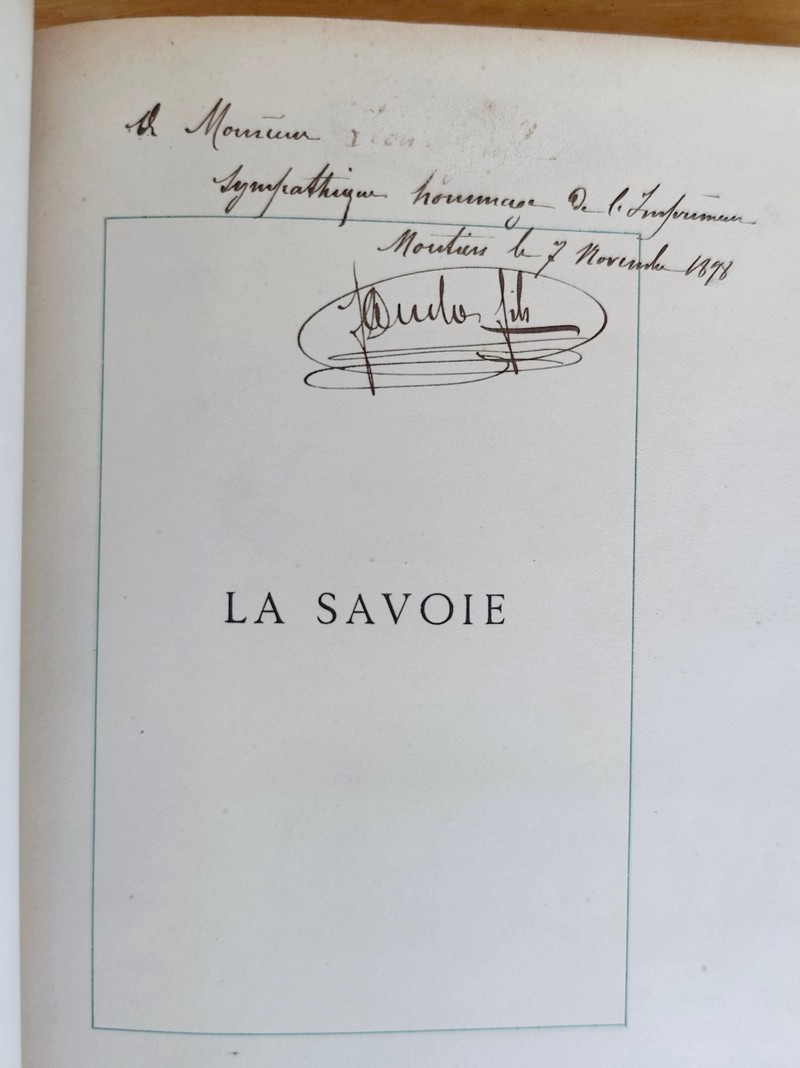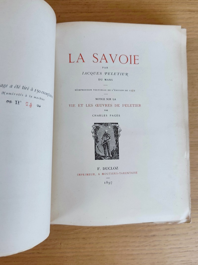 Description : Réimpression textuelle de l'édition de 1572, avec une notice sur la vie et les oeuvres de Peletier par Charles Pagès. F. Ducloz, 1897, imprimeur à Moutiers-Tarentaise. Dédicace autographe signée de l'imprimeur Ducloz Fils. Au format in 8 broché avec couverture défraichie, exemplaire justifié 74 sur 150. avec 177 pages, 4 ff, avec 5 planches hors texte dont 4 dépliantes, texte en deux couleurs, sous encadrement vert. Peu courant. A noter : Jacques Peletier du Mans, 1517 - 1583, est un mathématicien, médecin, grammairien et un poète humaniste français, membre de la Pléiade.