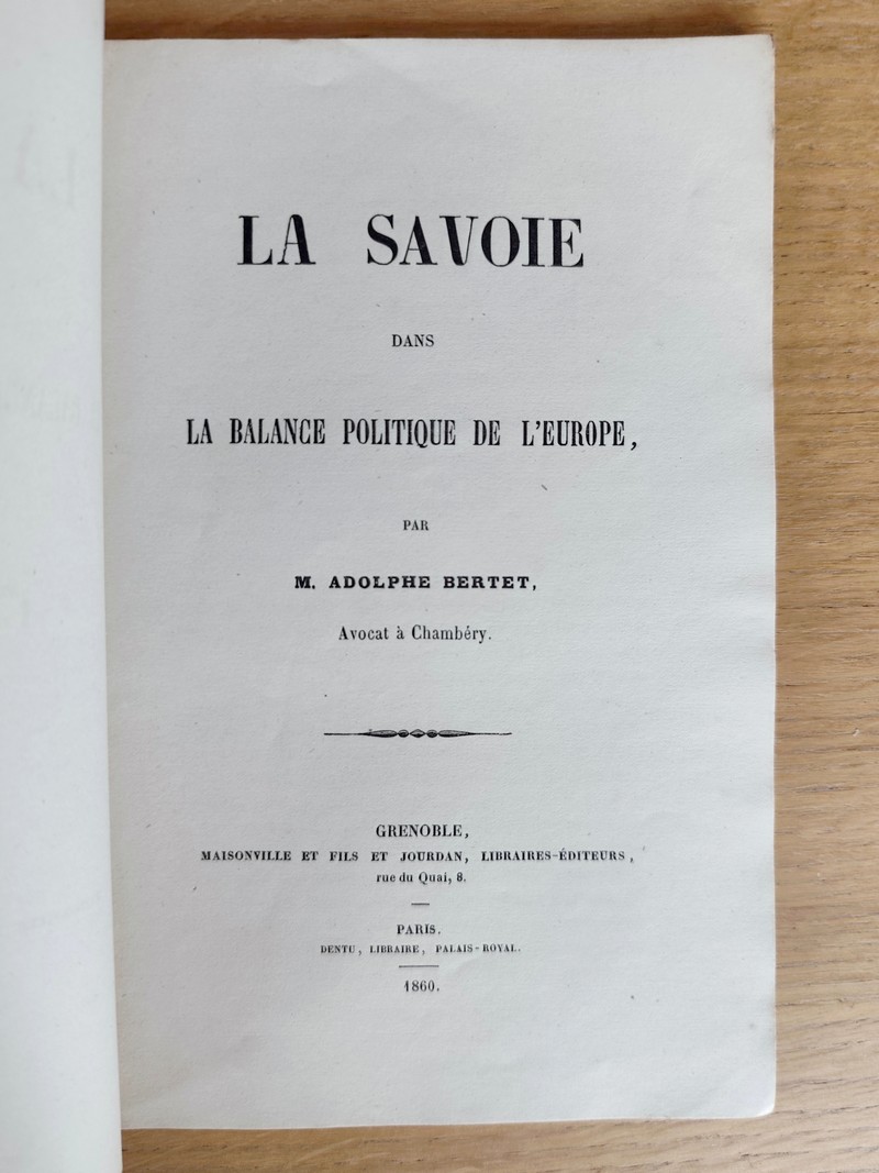 Description : Maisonville et fils et Jourdan, 1860, Grenoble. In 8 broché de 46 pages cousues, cachet timbre, en bon état. Plaquette pamphlétaire avant l'annexion de la Savoie à la France. L'auteur entrevoit 4 possibilités : Unie au Piémont, devenir un état indépendant, être réunie à la France ou à la Suisse avec la garantie de neutralité.
