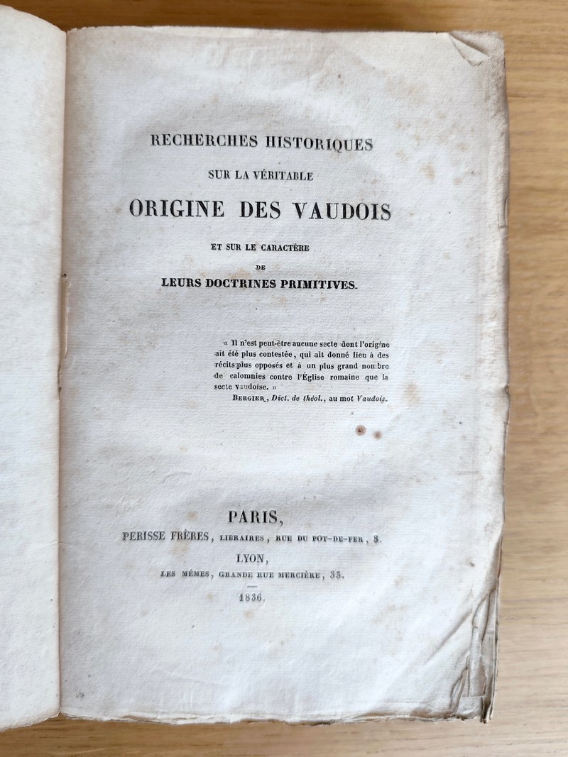Description : Perisse frères, 1836, Lyon, Paris. Édition originale au format in 8 broché défraichie et fragile avec coté abimé, pliures, comprenant XV, 539 pages, 1 ff d'errata. A noter : André Charvaz est un prélat savoyard (né et mort en Savoie, 1793-1870) est évêque de Pignerol lorsqu'il écrit ce livre dans l'anonymat en lien avec la présence d'une communauté vaudoise dans son diocèse. Mgr Charvaz y réfute les origines anciennes des Vaudois, il y explique les différences majeures avec le catholicisme. Il adjoint en fin d'ouvrage de nombreux documents et pièces justificatives en latin avec commentaires en français. Mgr Charvaz est ordonné prêtre à Chambéry, précepteur des enfants du Roi Charles Albert. En tant qu'érudit il participe au société savante de Savoie, il est l'un des fondateurs de société de la Val d'Isère, sa région de naissance. Évêque puis Archevêque de Gênes, territoire des états sardes par le traité de Vienne en 1815, il meurt à Moutiers en 1870.