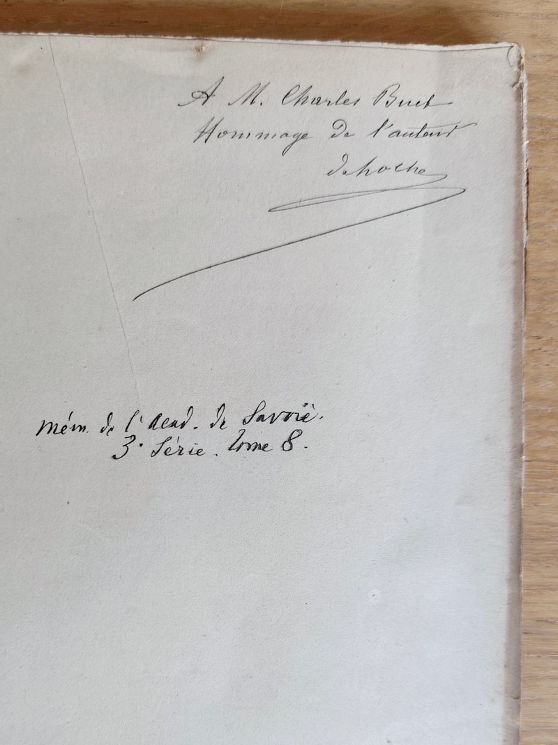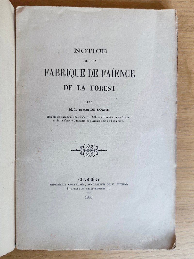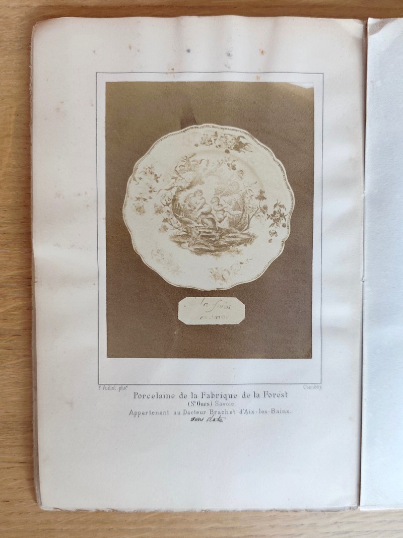 Description : Hommage manuscrit autographe signé de l'auteur à l'attention de Charles Buet. Imprimerie Chatelain, 1880, Chambery. Plaquette in 8 brochée avec dos cassé, renforcé par une pièce de titre, 51 pages + table, avec une photographie d'époque contrecollée sur papier fort « Porcelaine de la fabrique de la Forest appartenant au Docteur Brachet », plan de la fabrique. Sont joints, 6 ff des faïences de La Forest et Hautecombe venant d'un catalogue, 4 ff de notes manuscrites les faïenceries sardes, annotations en marge. A noter : la faïencerie La Forest se trouve sur la commune du Montcel et celle de Saint-Offenge. Créée par la famille Bouchard en 1730, elle devient la Société Bouchard et Dimier en 1792, puis en 1798 Dimier se sépare pour fonder les faïenceries de Hautecombe de 1798 à 1804. La faïencerie s'arrêtera en 1812 suite à la vente demandée par ses créanciers.