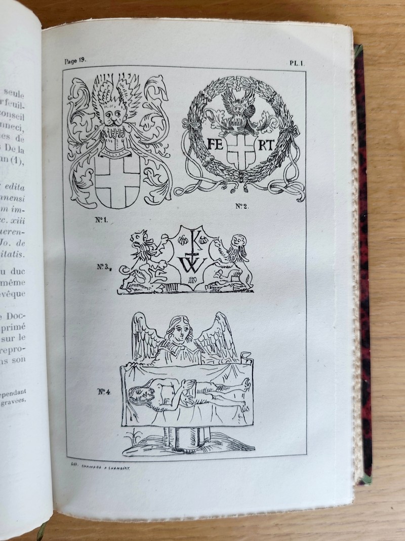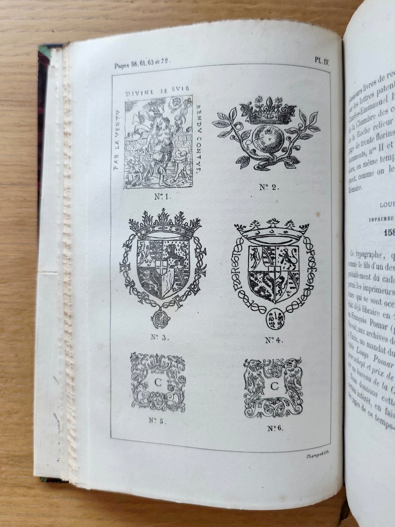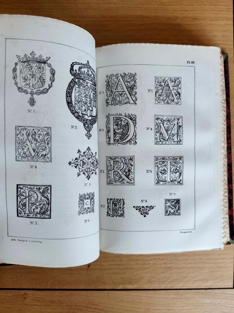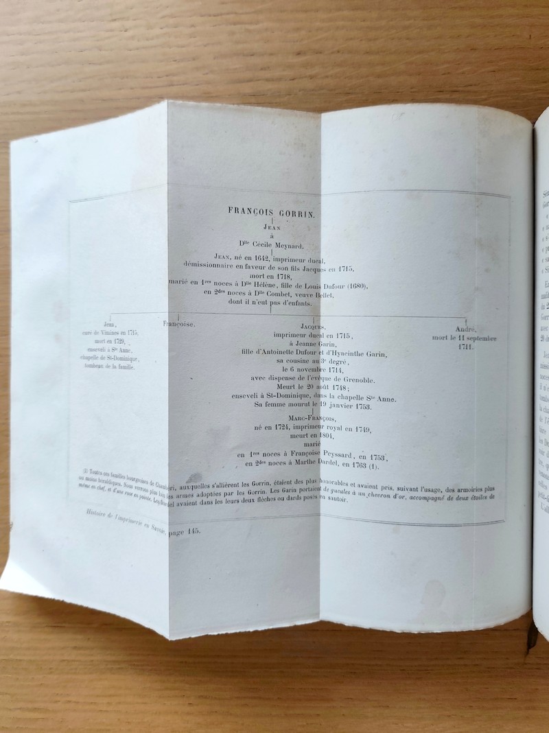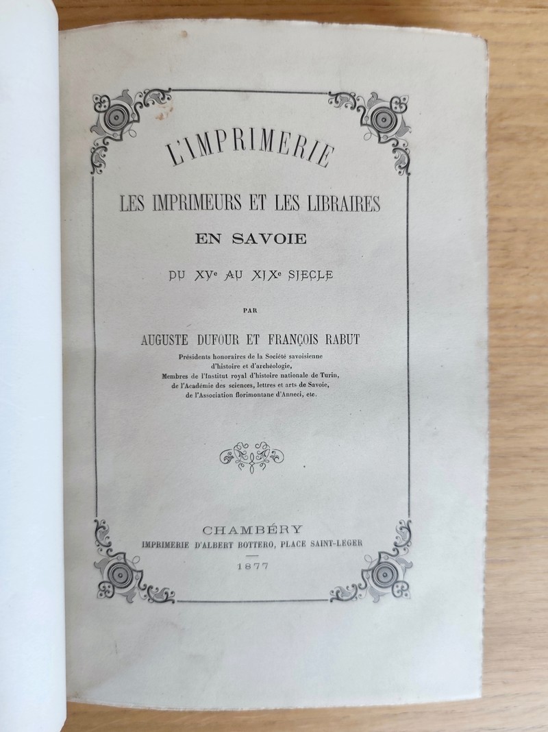 Description : Exemplaire de François Rabut avec son ex-libris et des suppléments. Imprimerie Albert Bottero, 1877, tiré à part des documents du SSHA tome XVI, Chambéry. Au format in 8 de 415 pages sur un papier de qualité grand de marge, avec vignettes dans le texte, 13 lithographies par Champod de marques, des culs-de-lampe, de lettres ornées, 1 tableau dépliant de généalogie de F. Gorrin. un ajout de 14 pages de fac-similés contre collés de marques d'imprimeurs avec pour suite à la sortie du livre, une lettre autographe de 4 pages, ainsi que deux articles de journaux. Le tout relié dans un demi chagrin, dos à nerfs, caissons ornementés, en très bon état.