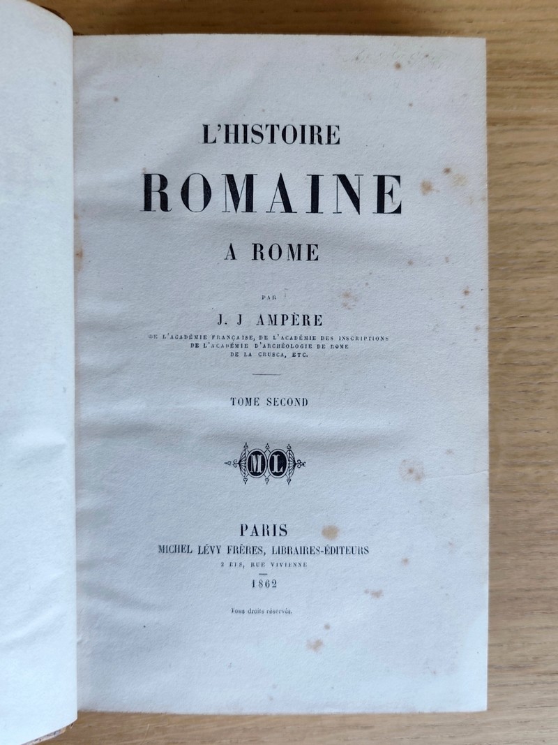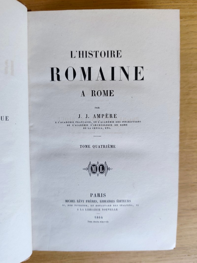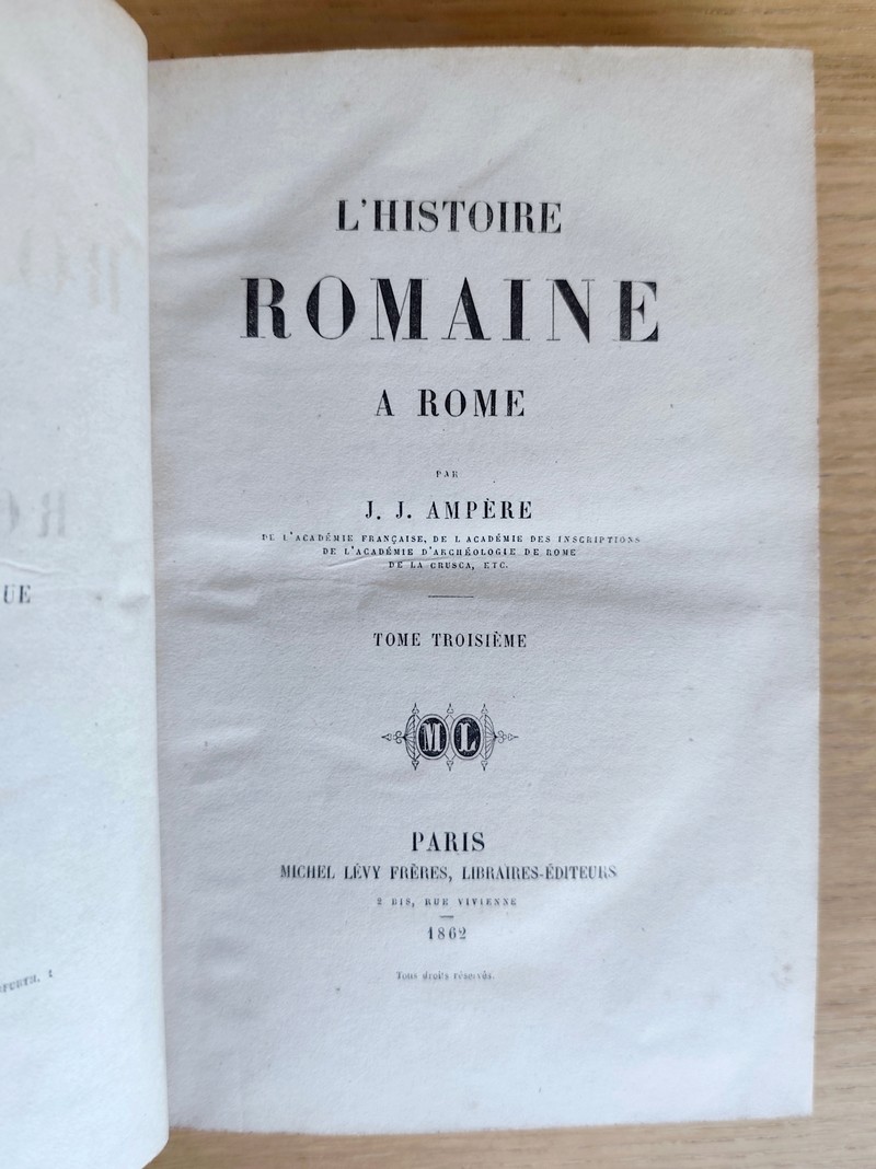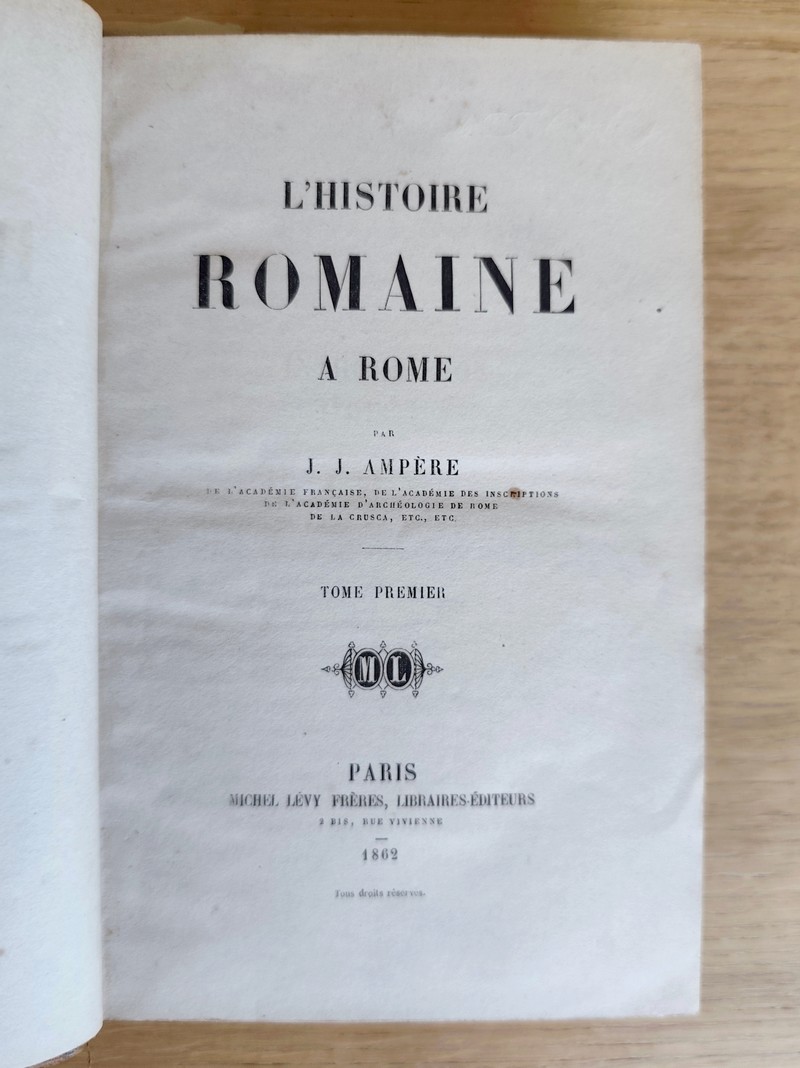 Description : Michel Lévy frères, 1862 - 1864, Paris. 4 volumes in 8 comprenant Tome I : LXIII, 495 pages, 2 ff, 1 grande carte dépliante « Rome primitive » - Tome II : 577 pages, 2 ff, 1 grande carte dépliante « Rome sous la République » - Tome III : 624 pages, 1 ff - Tome IV : 639 pages. Le tout en reliure uniforme d'époque, en demi basane claire, pièce de titre et de tomaison, en assez bon état.